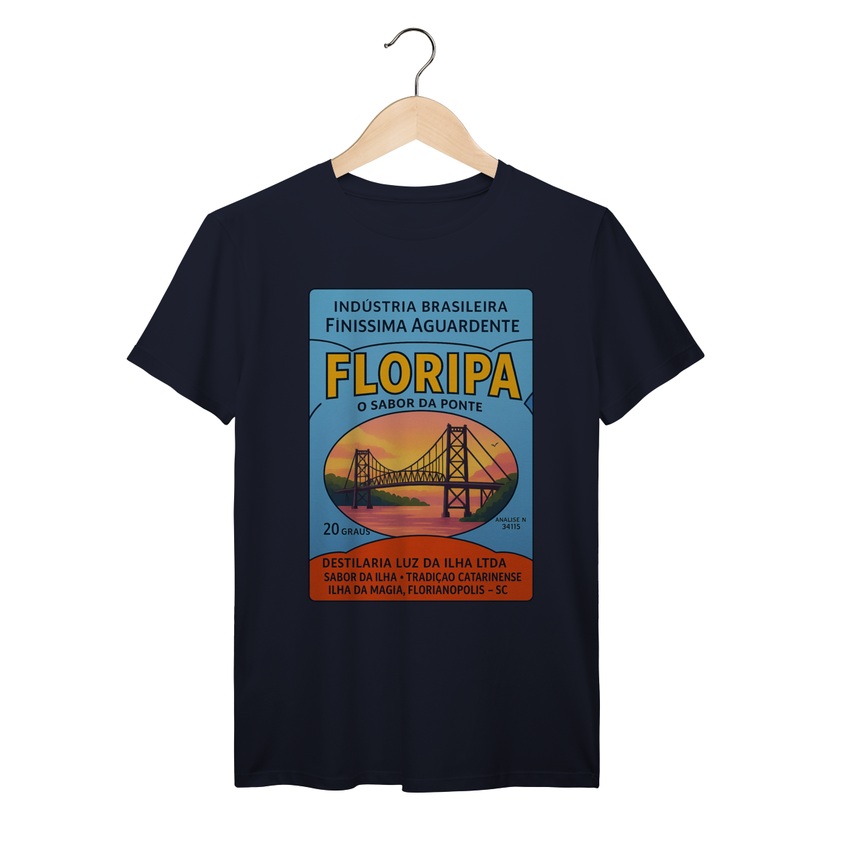 Inspirada nos rótulos clássicos de aguardente brasileira, esta arte celebra Florianópolis e sua icônica ponte Hercílio Luz ao pôr do sol. Um design vintage que mistura tradição catarinense, mar e paisagem inesquecível.