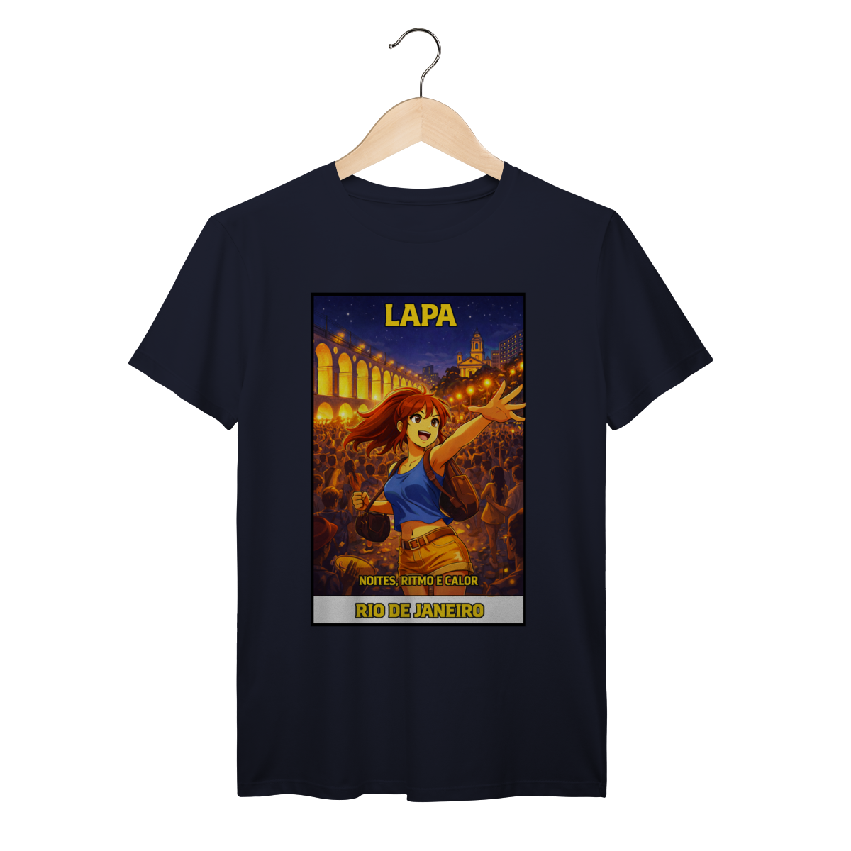 A Lapa é onde o Rio ganha vida depois do pôr do sol. Entre os Arcos iluminados, rodas de samba e multidões dançando, este design captura a energia elétrica das noites cariocas e a sensação de fazer parte da festa.