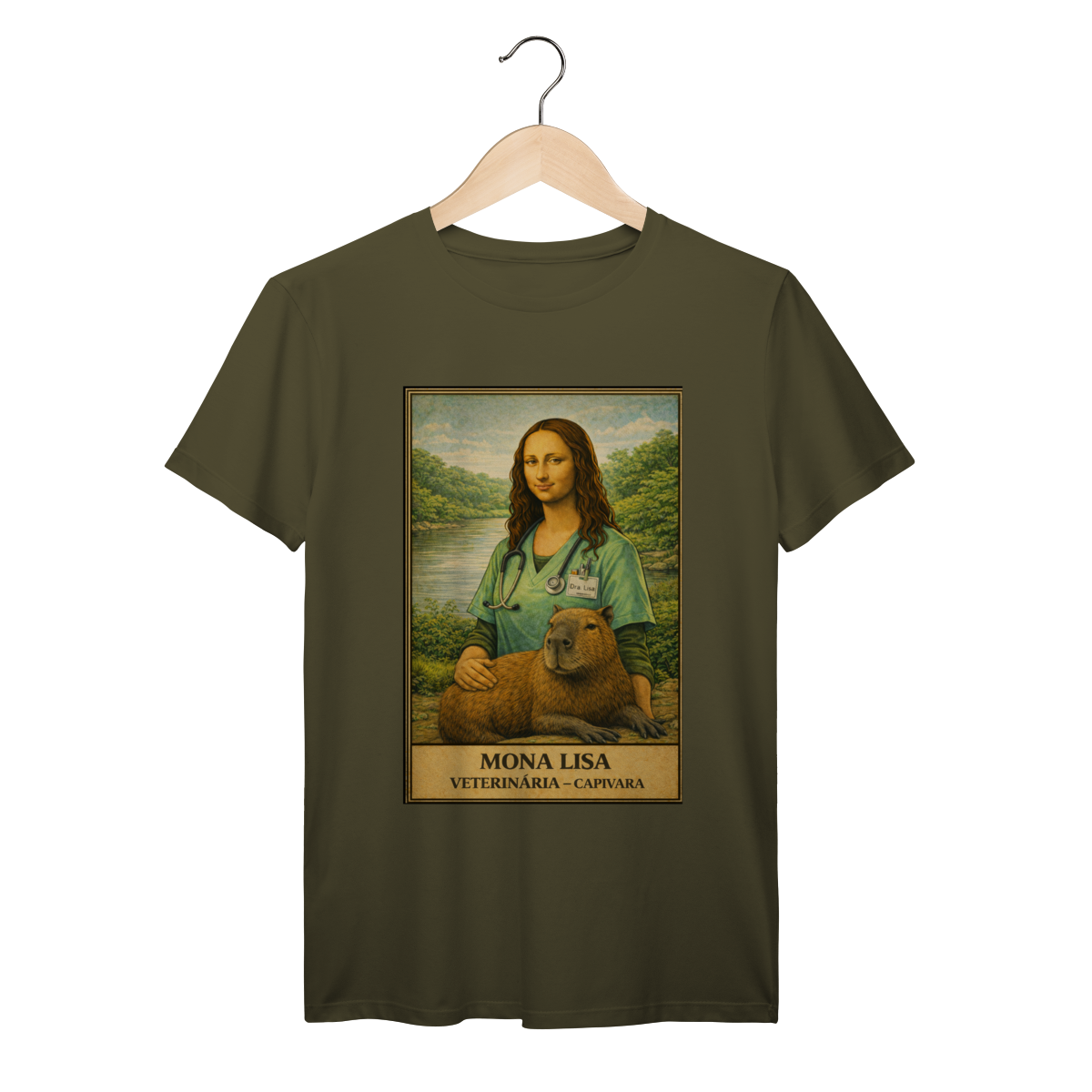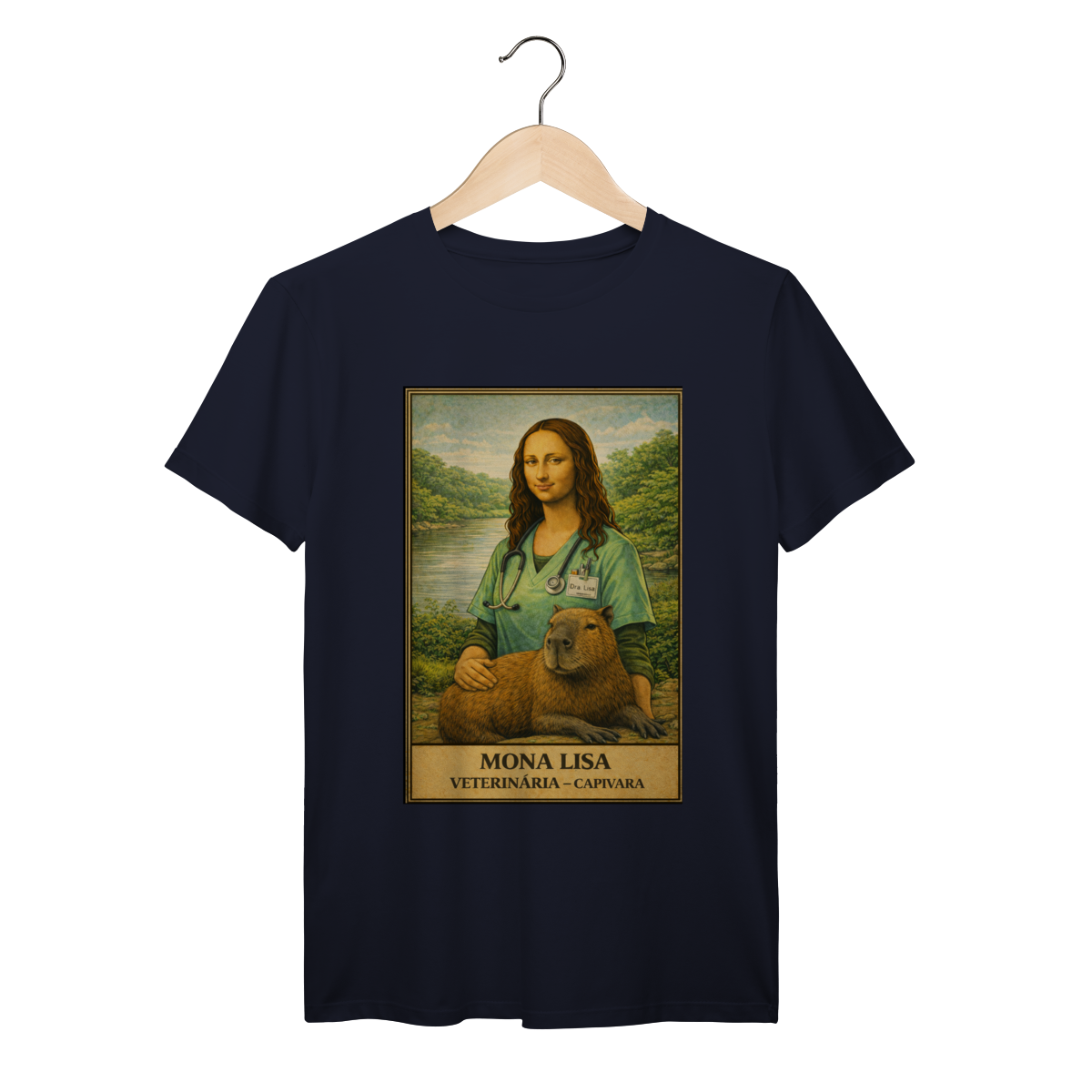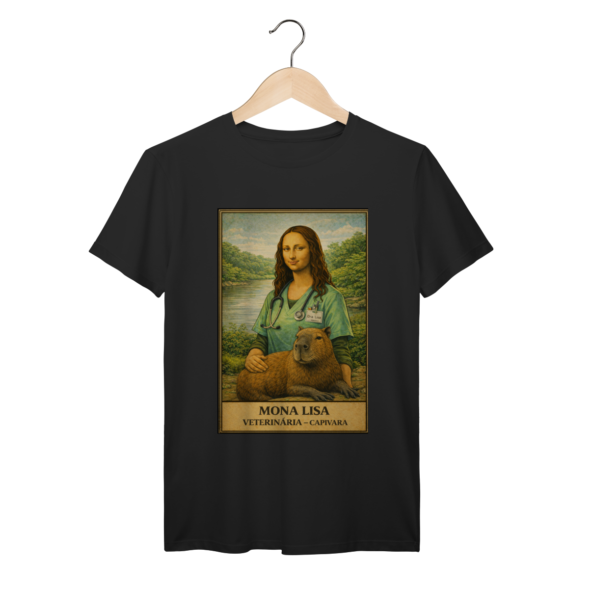 Ícone da fauna brasileira, a capivara ganha protagonismo ao lado da Mona Lisa veterinária. Um design que mistura humor, natureza e orgulho da biodiversidade do Brasil.