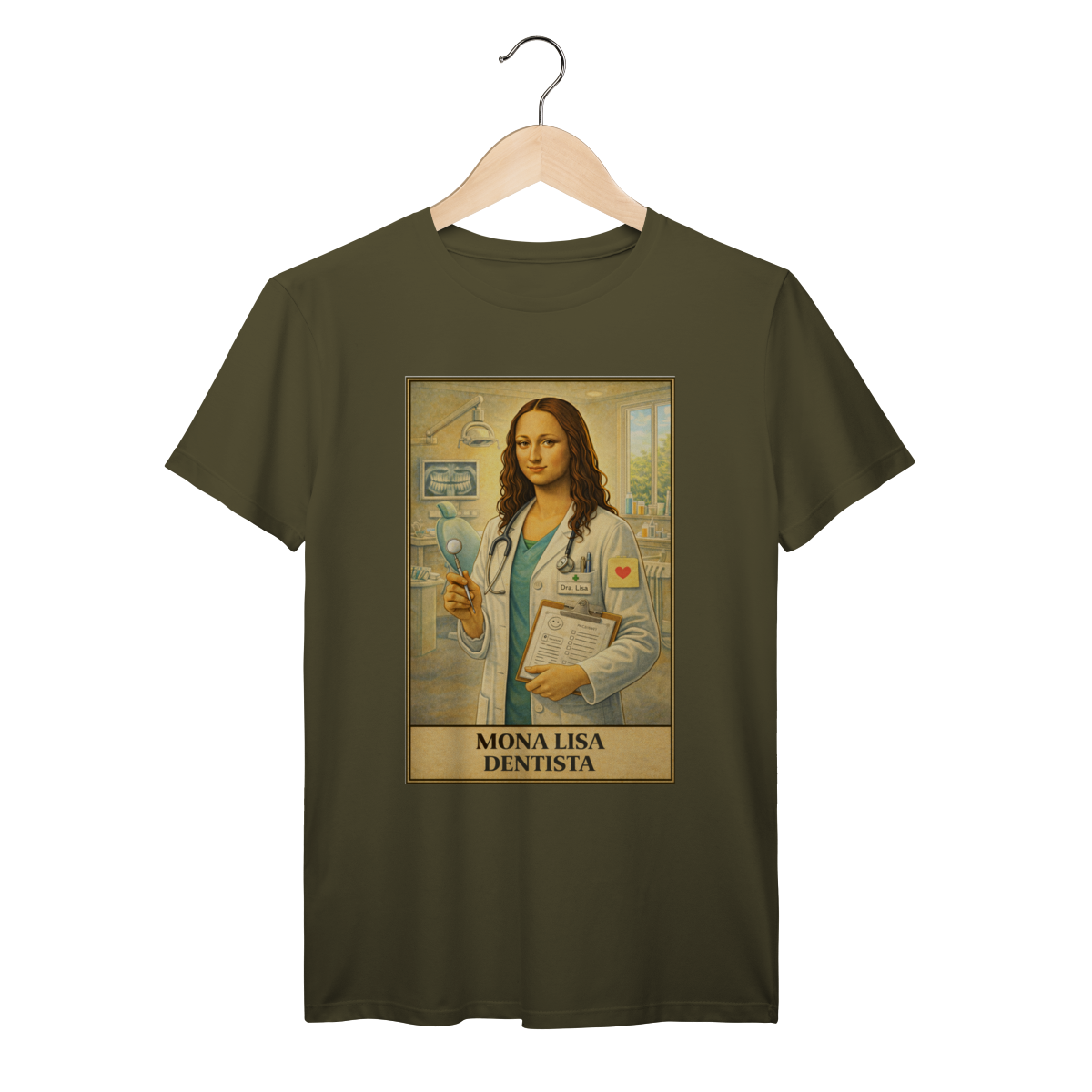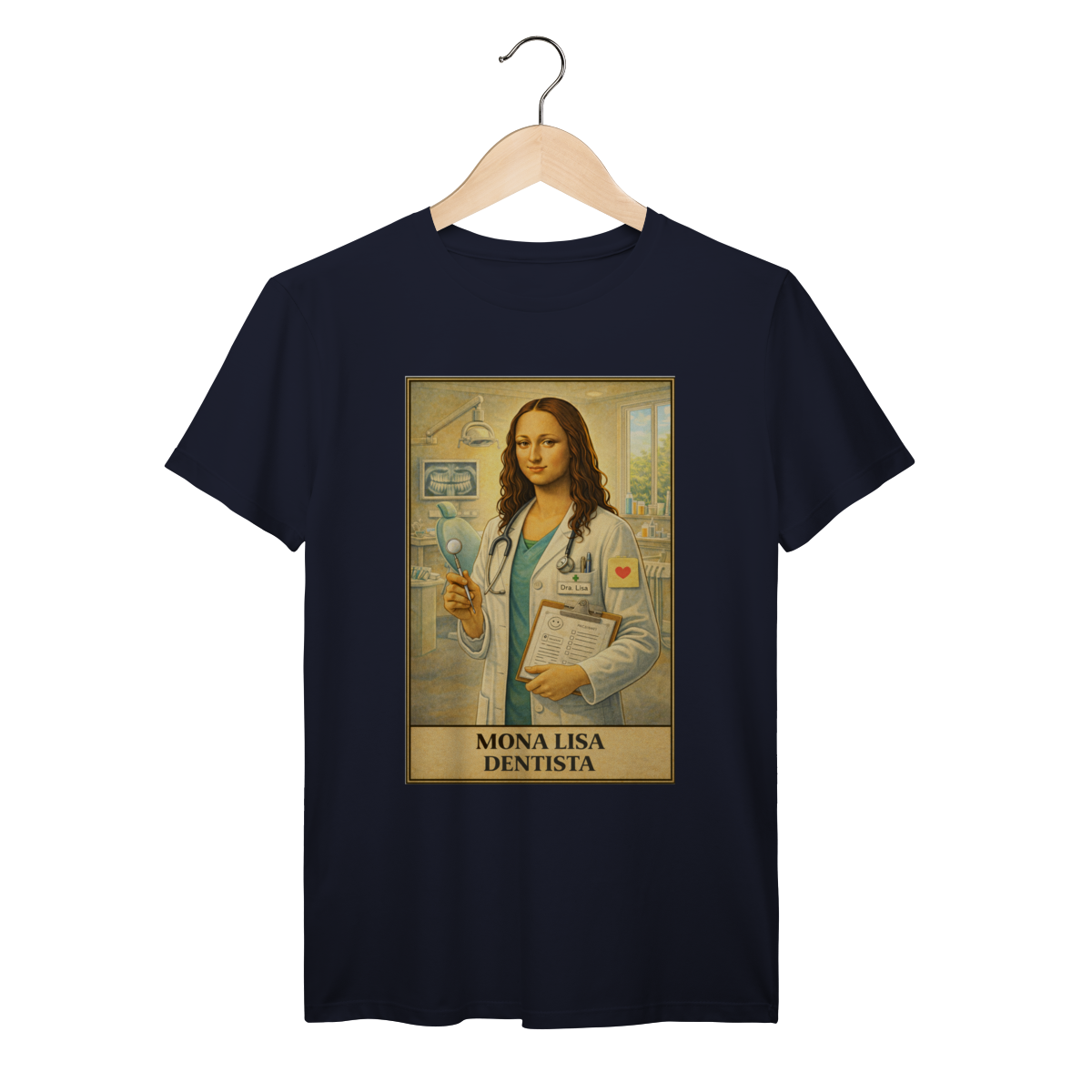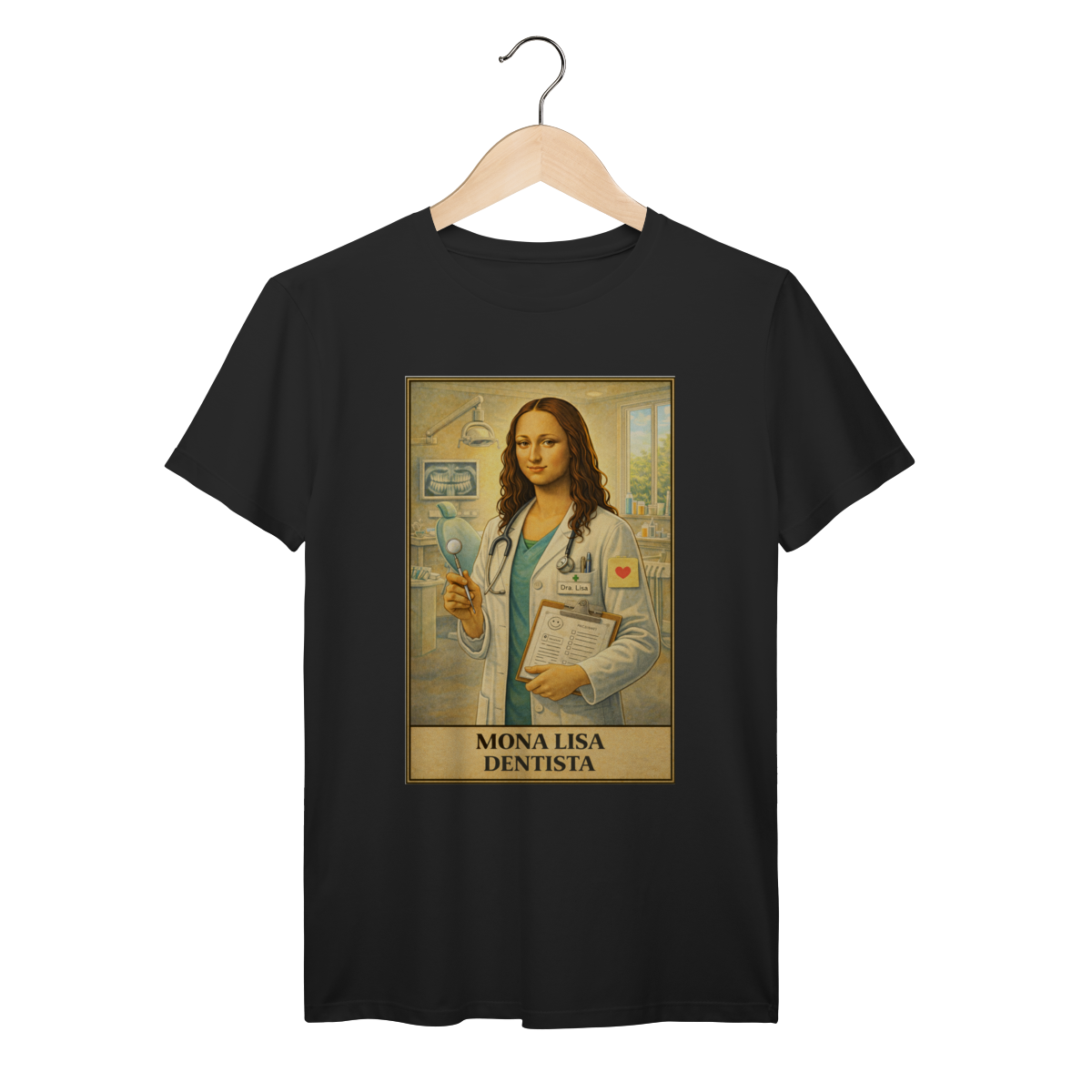 No consultório odontológico, Mona Lisa representa o cuidado com o sorriso e o bem-estar dos pacientes. Um design leve e bem-humorado que homenageia profissionais dedicados à saúde bucal.
