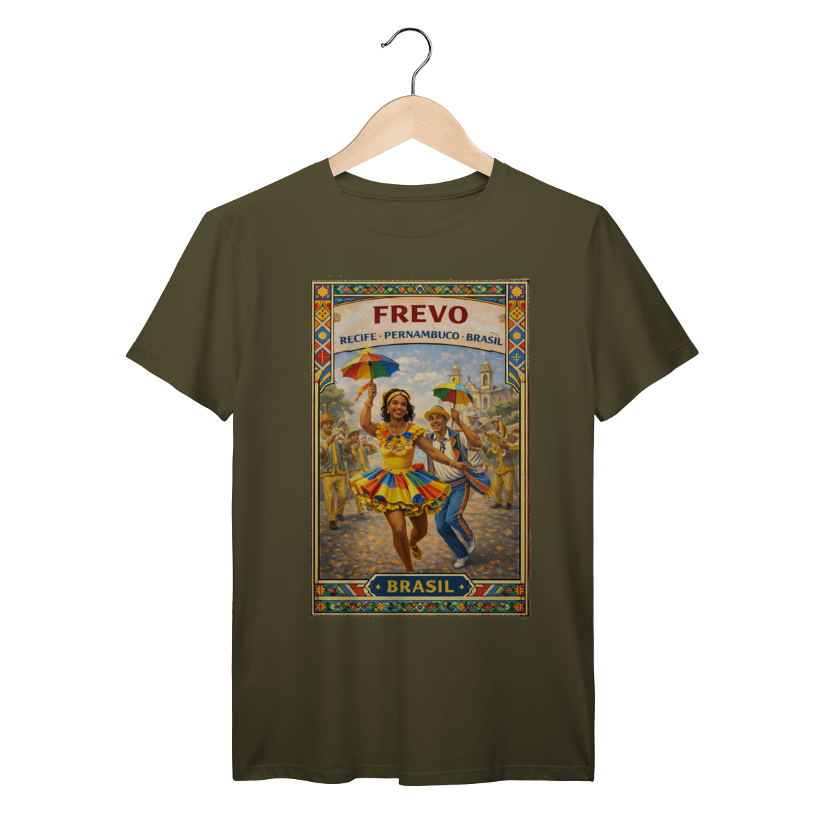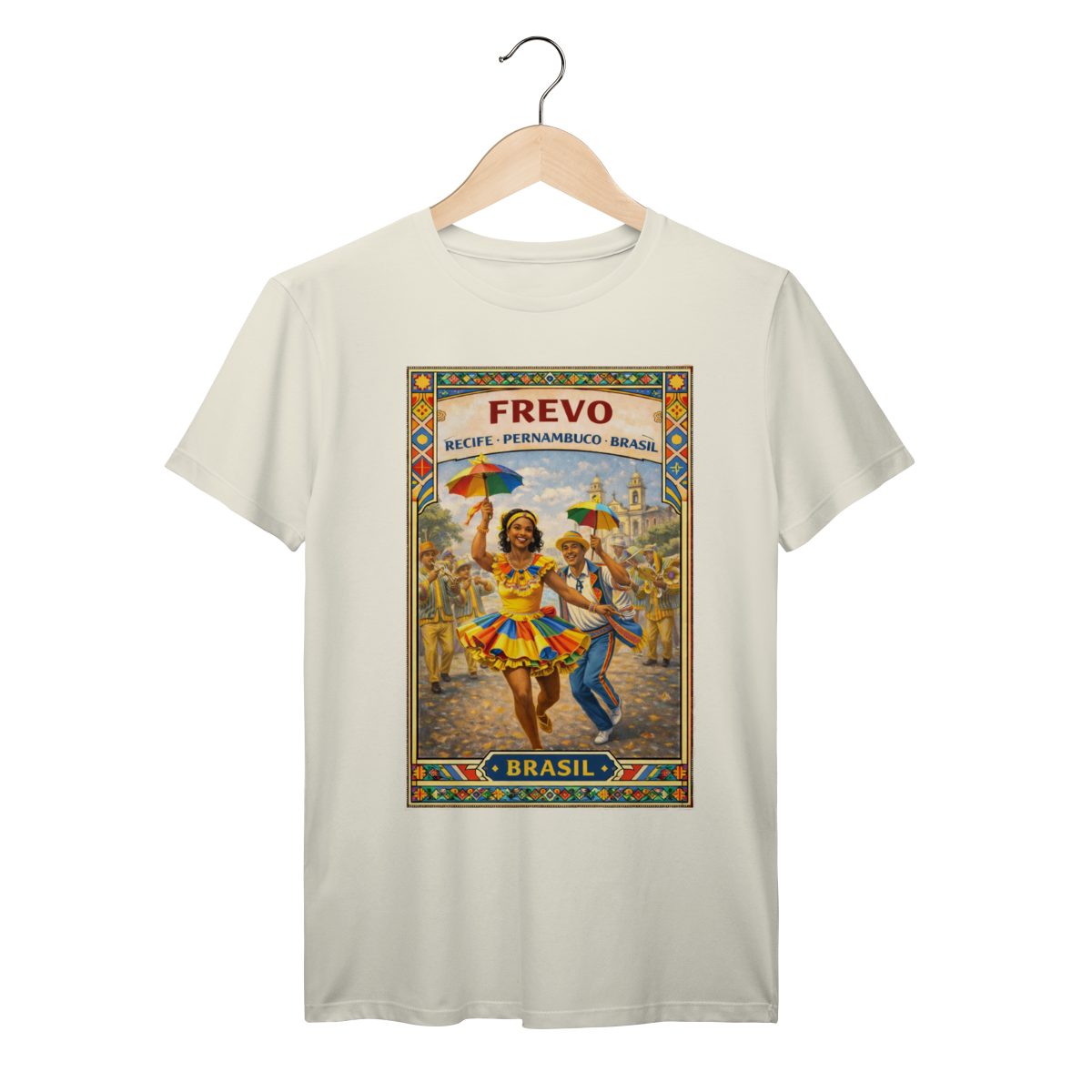 Frevo is pure motion — a dance of spinning umbrellas, quick footwork, and carnival energy that fills Recife’s streets with life. This design captures the vibrancy and rhythm of one of Brazil’s most dynamic cultural expressions.