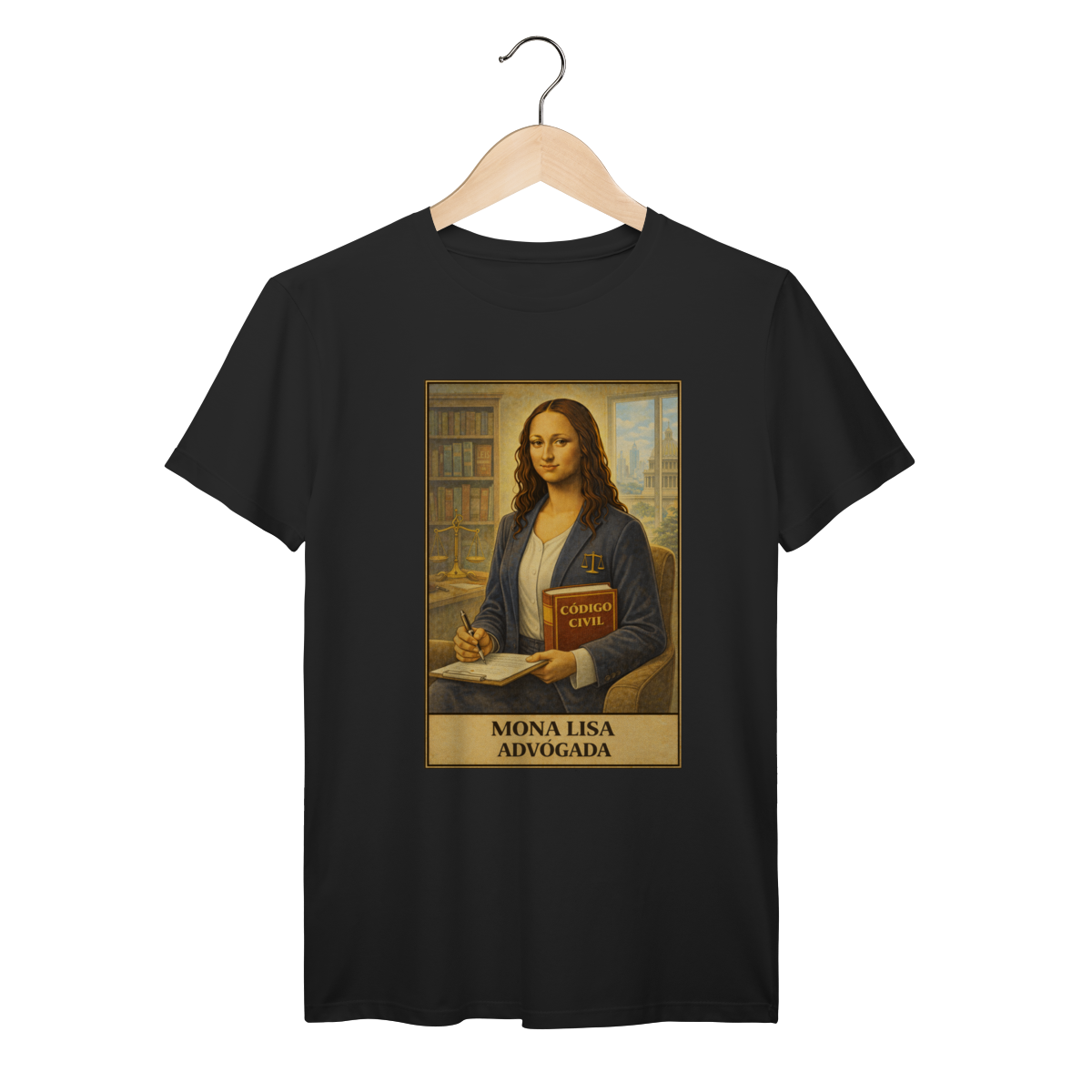 Entre livros jurídicos e decisões importantes, Mona Lisa representa a profissão jurídica com elegância e firmeza. Um design que homenageia quem trabalha diariamente em defesa de direitos e justiça.