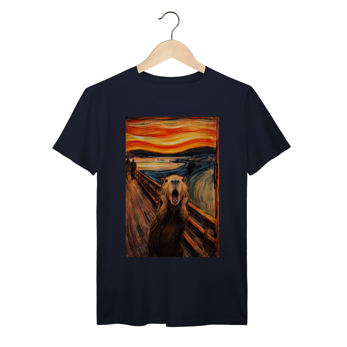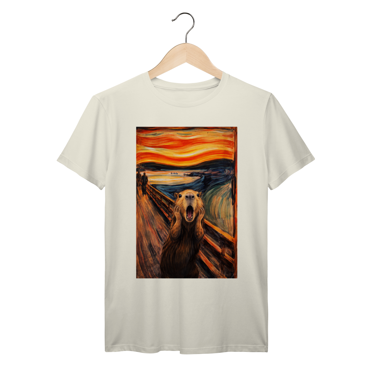 A capybara channels pure dramatic energy in this playful parody of a famous expressionist painting. With a fiery sky and swirling ocean behind it, the world seems overwhelming—even for the chillest animal in South America.