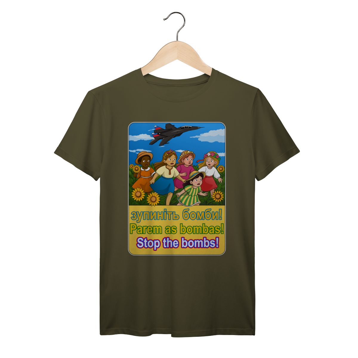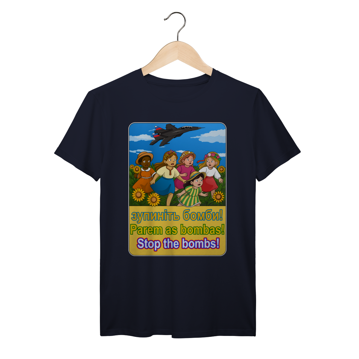 Sunflowers and childhood meet the shadow of modern warfare. This design doesn’t whisper — it reminds us who pays the highest price when bombs fall.