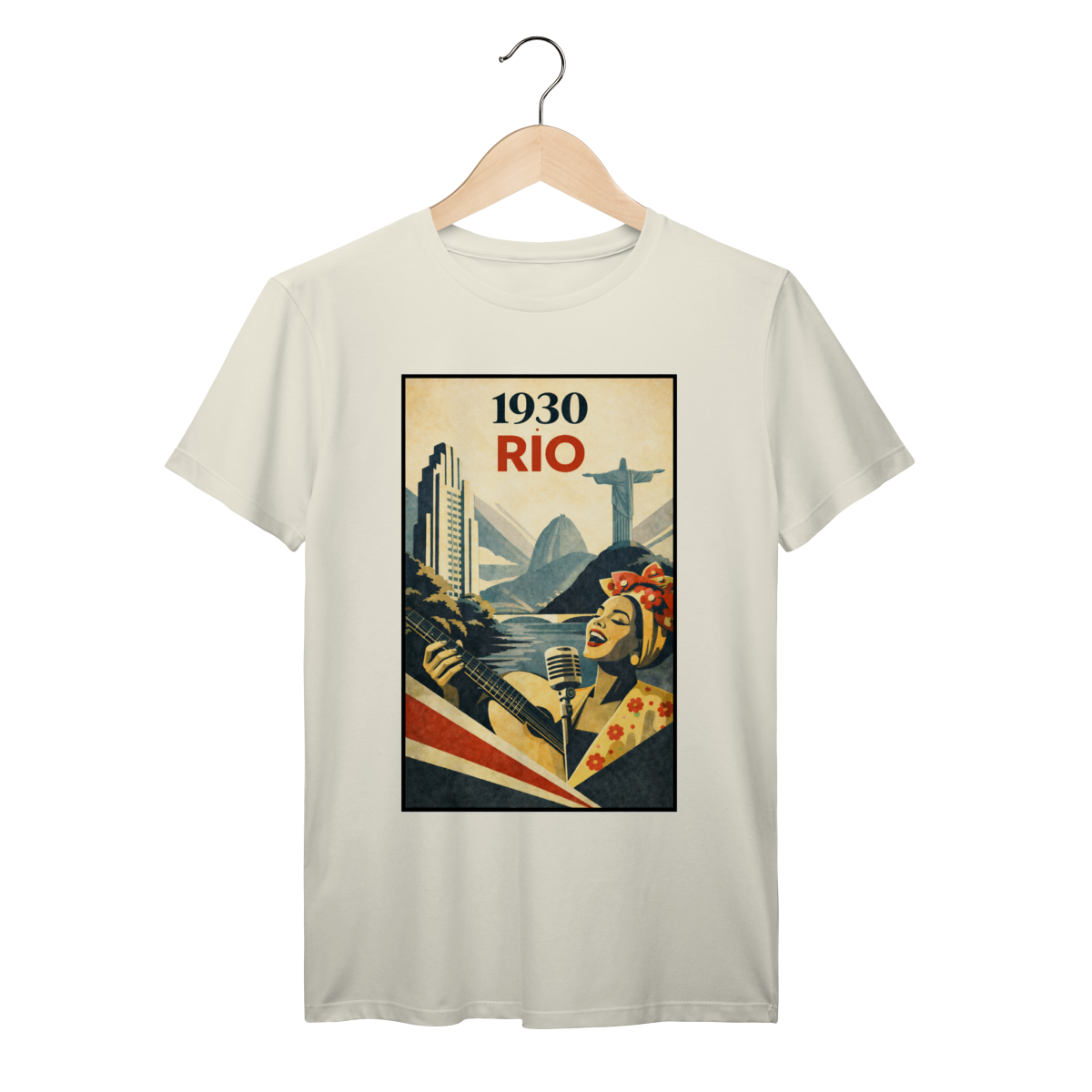 Echoing the golden age of Brazilian music, this piece blends urban scenery with performance imagery to evoke rhythm, nostalgia, and timeless Rio charm. It feels like an old record cover rediscovered and reborn as wearable art.